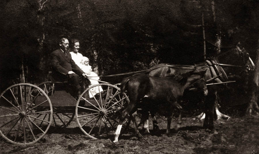 The first buggy. baby, horse and colt. This may be the buggy that they purchased when they first arrived in Minnesota. |
